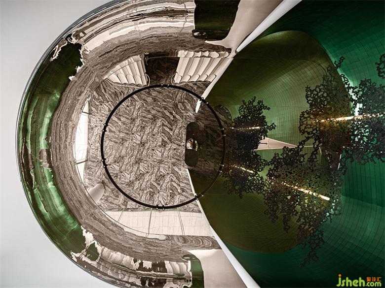 沙盤區(qū)的整體構造完美承接空間形態(tài),藝術裝置采取云的意向,由數(shù)千片手工鍍銀的葉片組成。