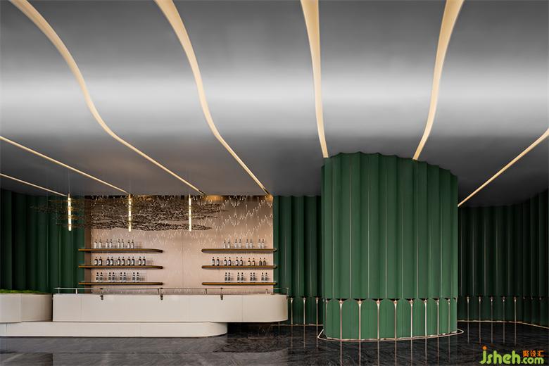 武漢售樓處設(shè)計(jì)擁有金屬質(zhì)感的光帶是空間基底,閃著熠熠星光。金色是貫穿性的存在,金珠與金帶交協(xié),切割各自的功能領(lǐng)域。頂部的曲線構(gòu)筑和燈光使空間柔化而充滿形態(tài)感,帶來更多的空間想象。