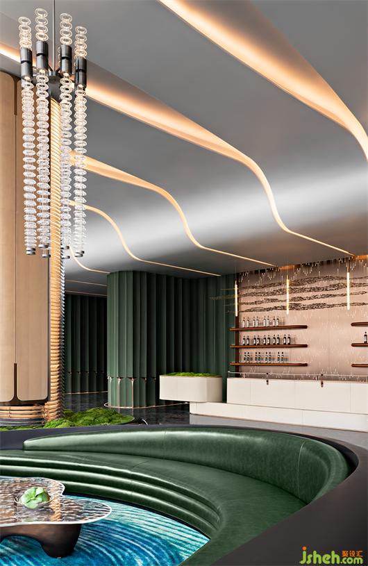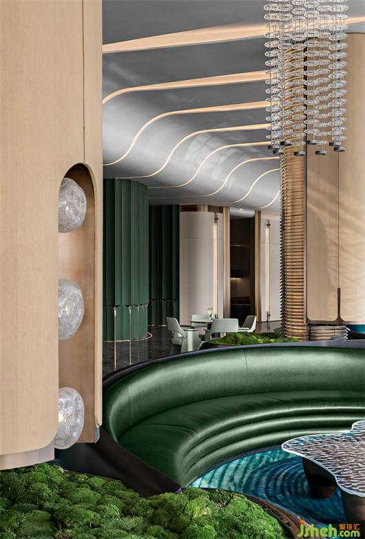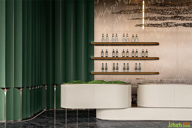 吧臺(tái)背景板上是發(fā)光的亞克力材質(zhì),擬態(tài)自然雨滴墜落,白色皮革包裹吧臺(tái)全周,武漢售樓處設(shè)計(jì)以苔蘚點(diǎn)綴,質(zhì)感金屬線條縱橫,著重突出空間的穩(wěn)持、高奢的氛圍。