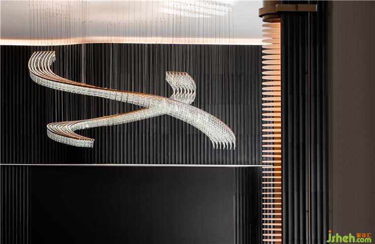 沙盤區(qū)上方懸掛的水晶吊燈,提取淮水丘陵之態(tài),營銷中心設(shè)計師在此基礎(chǔ)上進行二次創(chuàng)作,寓意山河此起彼落,相擁而生。