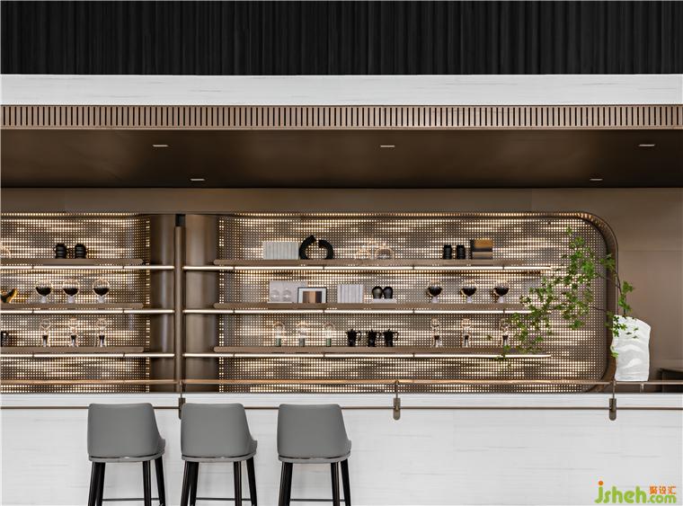 水吧區(qū)域簡明利落的造型消弭與訪者的距離,營銷中心設(shè)計皮革座椅搭配波普風格,閑適與摩登并存。