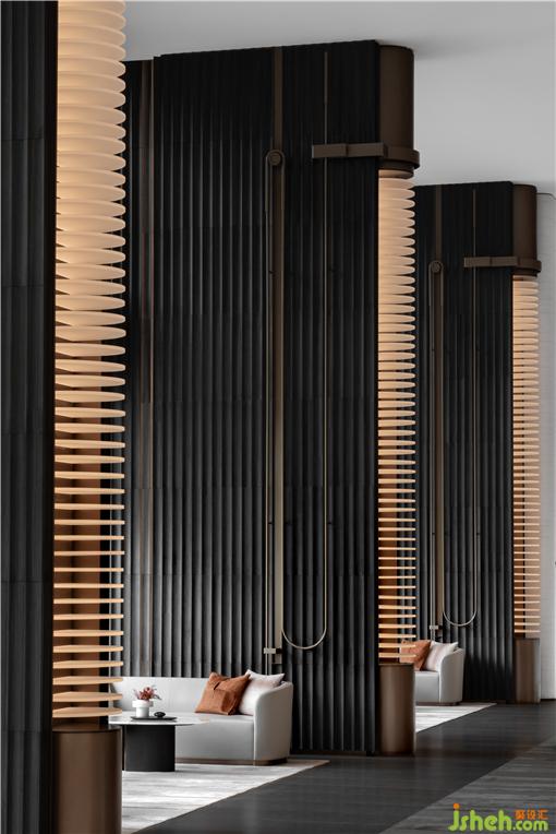 墻面波浪般起伏的細密線條與天花弧線形成自然呼應(yīng),規(guī)整的序列構(gòu)成,營銷中心設(shè)計藝術(shù)般呈現(xiàn)空間的靈動生機。