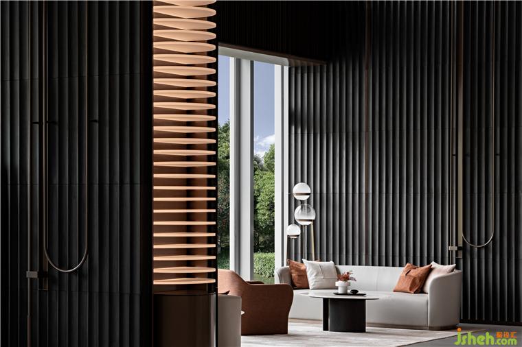 冷峻的柱體雕刻細(xì)節(jié)中的肌理變化,不銹鋼底座搭配金色燈柱,沉著的低調(diào)在材質(zhì)的疊加中營(yíng)造的靜謐氛圍。