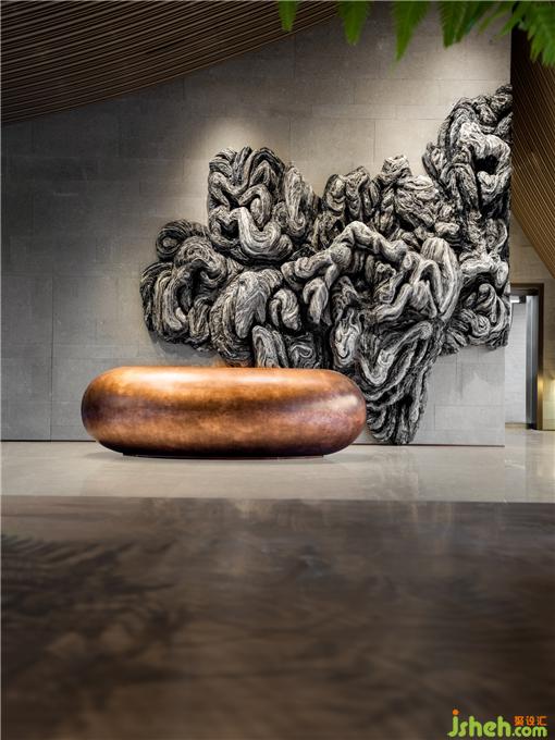 前廳的接待處如同一個金色大缽,包容萬境,墻面的粗曠質(zhì)地帶來亙古原始質(zhì)感,紙線裝置融入其中體現(xiàn)東方設(shè)計特有的禪境。