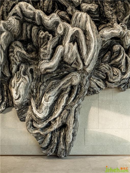 藝術(shù)裝置以《千里江山圖》為靈感來源,融合對纖維的藝術(shù)理解,打造紙墨山海裝置,展現(xiàn)出山水意境與東方美學(xué),山巒連綿、高低重迭。