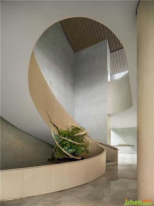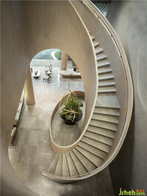 樓梯的月白之光因形體散發(fā)浪漫的質(zhì)感,營銷中心設(shè)計與金色扶手相映交織,融景于境,帶來不同視角的多重觀賞。
