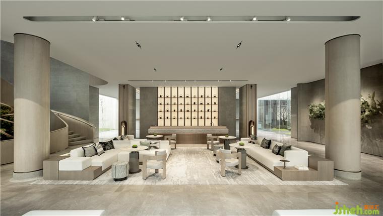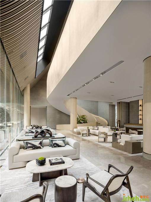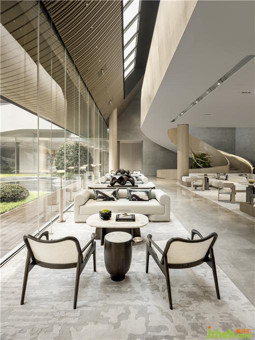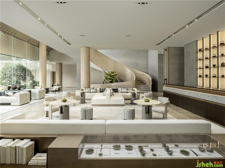 營(yíng)銷中心設(shè)計(jì)通過結(jié)構(gòu)、材料、材質(zhì)之間的關(guān)系探索空間的品質(zhì),在高低錯(cuò)落中展示美感。月白色微水泥鋪滿空間,呈現(xiàn)干凈純粹的東方意象,一派超脫飄逸之態(tài)。