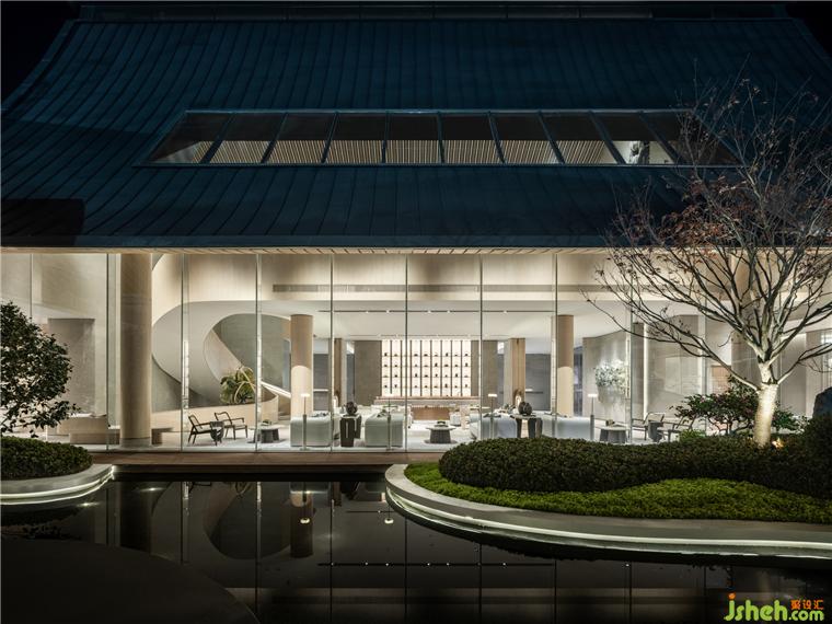 與君初識(shí),會(huì)客有道,小聚茶香滿室。茶室以茅屋草舍、堂空響旗為設(shè)計(jì)元素,層疊的木作線條堆砌一面長(zhǎng)方壺墻。