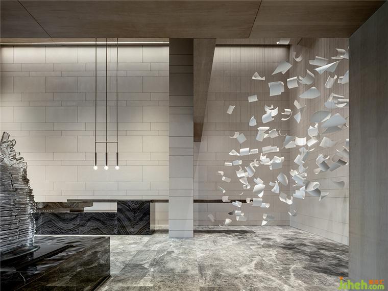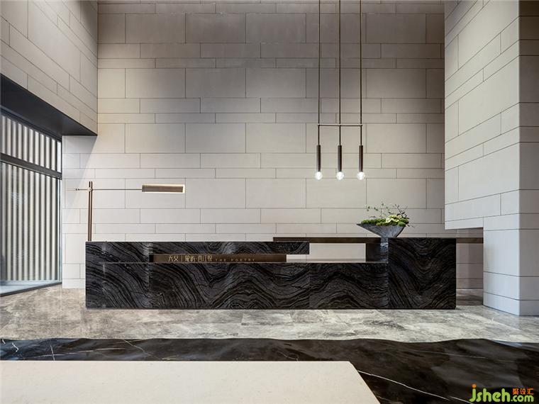 整體空間使用純粹細膩的沙白色大理石,抽象花紋的大理石地面,銷售中心設計配合線型燈具設計打造簡約的空間意境。
