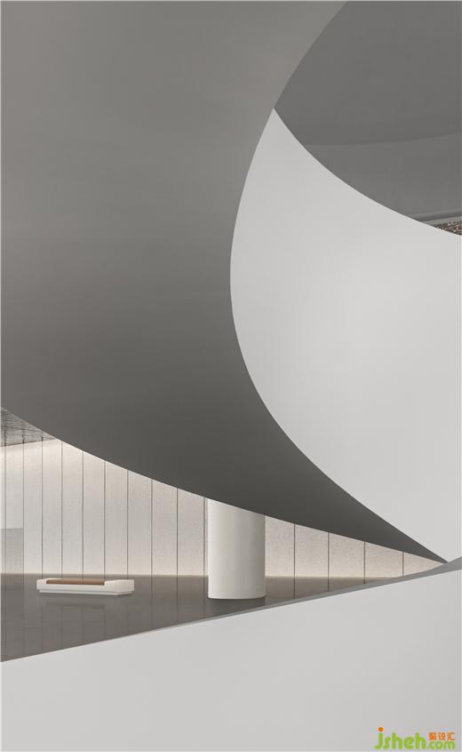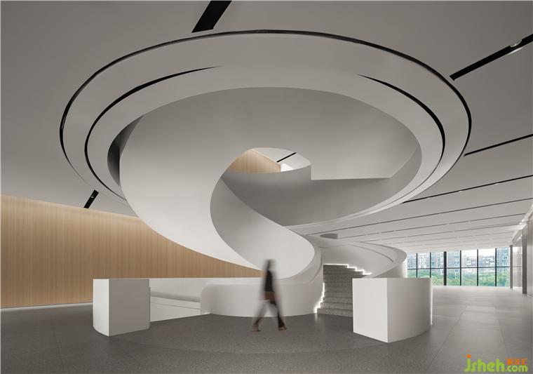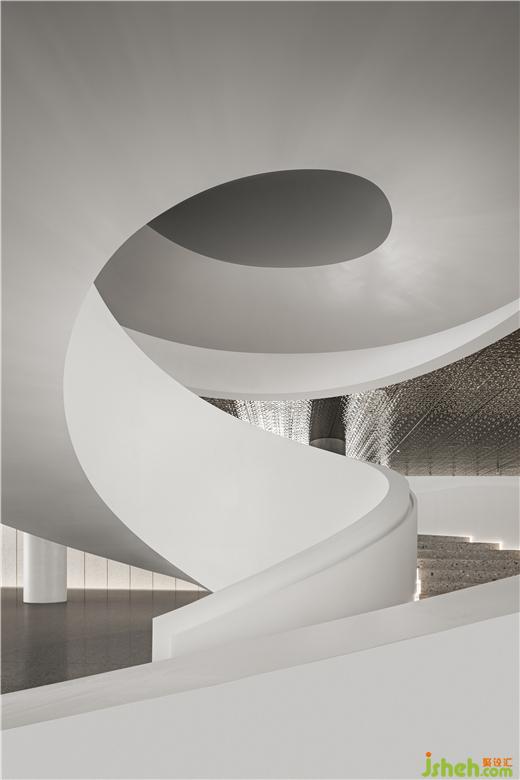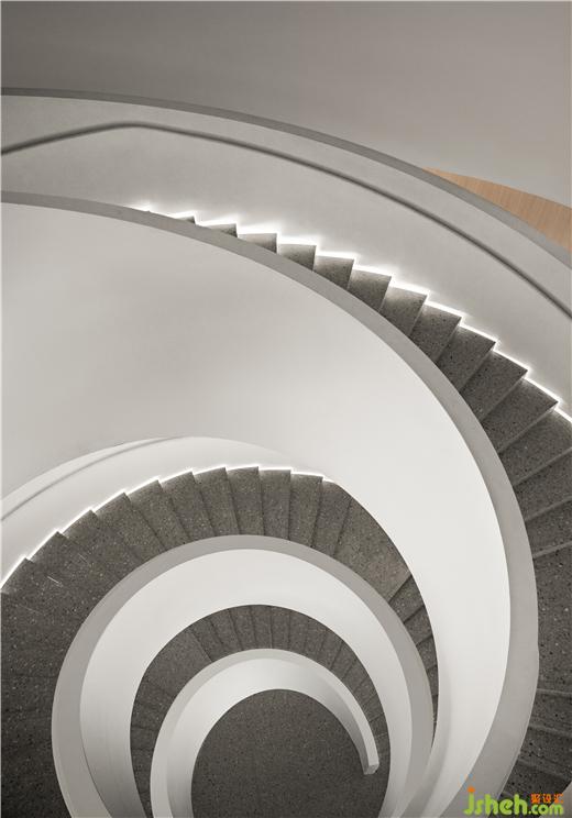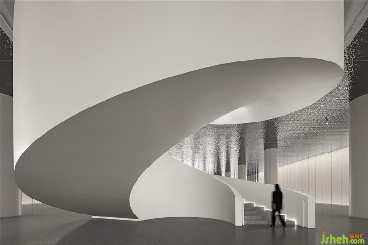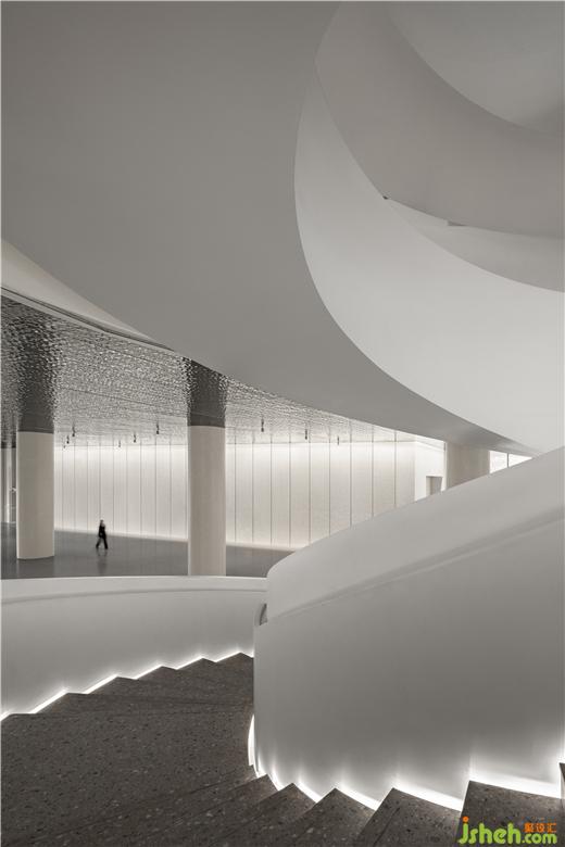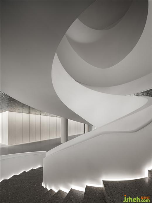 弧形旋轉(zhuǎn)樓梯如同雕塑,覆以白色藝術(shù)涂料,公共藝術(shù)中心設(shè)計(jì)勾勒出空間深度也劃分空間功能。