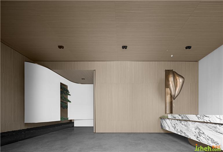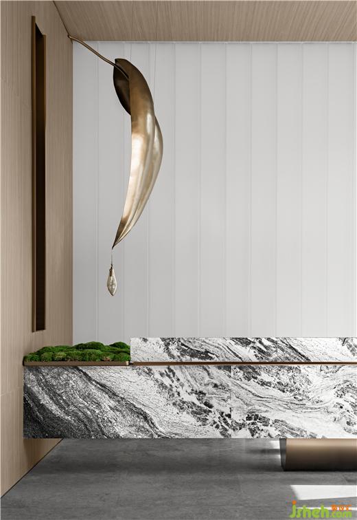 一滴水就是一恒河。如波似浪的大理石接待臺,對應(yīng)從巨大花葉上滾落的水滴,是物我渾然為一而兼忘的禪意。東境潤府營銷中心設(shè)計用堅硬的材質(zhì)訴說流動的美感,將生命盎然的意趣凝固成永恒。