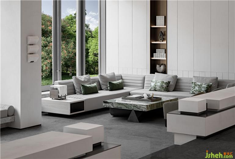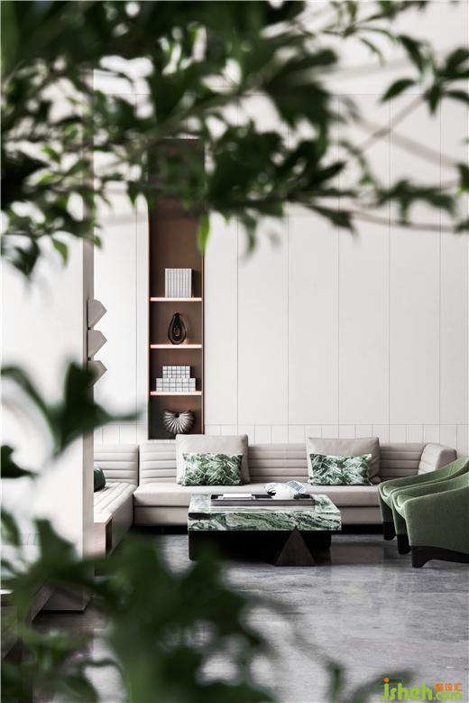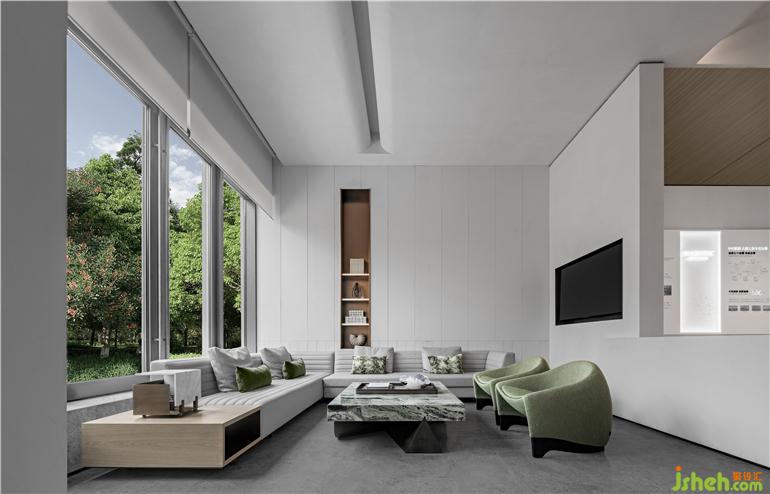 順應(yīng)自然的有機形態(tài),追隨時光的歸屬記憶,圓潤鵝卵石座椅躺在如堤岸般方正的沙發(fā)旁,東境潤府營銷中心設(shè)計幾何形的精巧壁燈對應(yīng)茶幾硬朗的線條,碧綠色水波紋流淌串聯(lián),簡潔的設(shè)計語言將空間融于自然環(huán)境中。