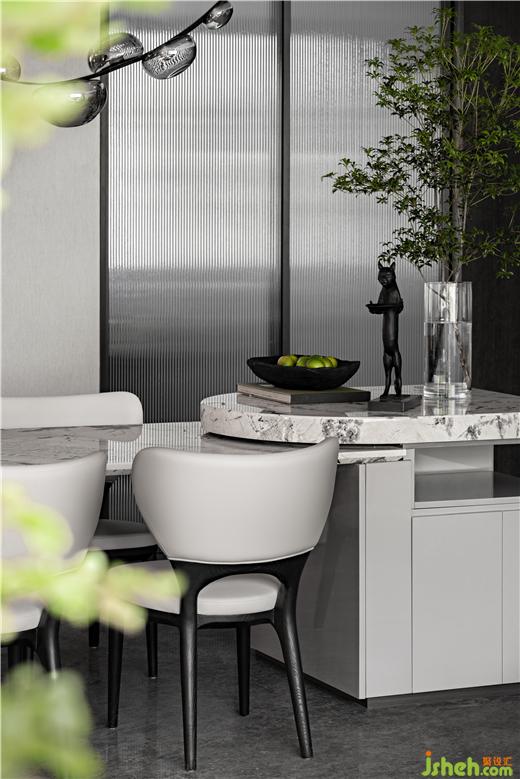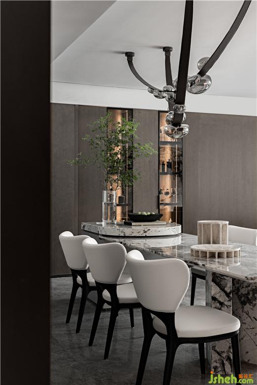 水珠樣裝飾燈懶味懸垂,餐食空間與島臺(tái)設(shè)計(jì),東境潤府營銷中心設(shè)計(jì)與餐廳一體形成互動(dòng)的小場域,女主人烹飪之時(shí),更有家人賞藝陪伴。