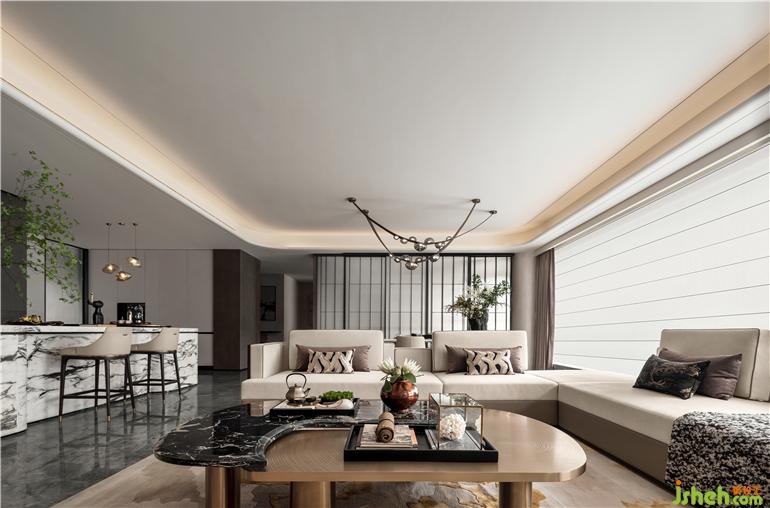 杭州縵云樣板房設(shè)計利用客觀優(yōu)勢,客廳兩側(cè)楹柱與寬敞的落地窗景結(jié)合,仿若置身庭院觀景亭中,營造親近自然的生活意趣。