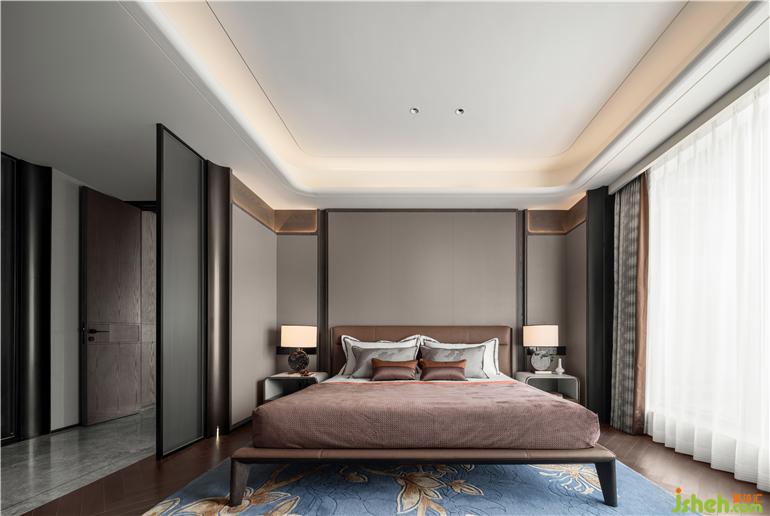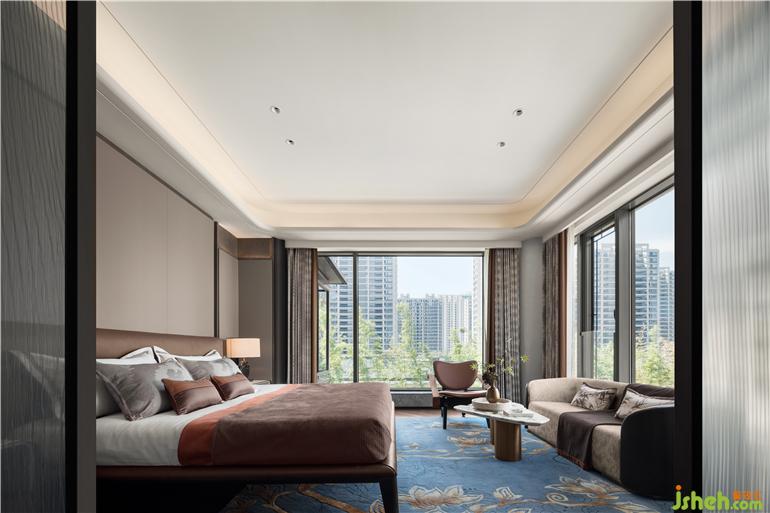 室外曲徑通幽,室內(nèi)鳥語花香。植物花鳥織就地毯,名為深竹月的藍(lán)與窗外如洗的天空交映,在莊重典雅的底色上,透出細(xì)膩溫暖的氣質(zhì),給靜謐的臥室?guī)砩鷻C(jī)。