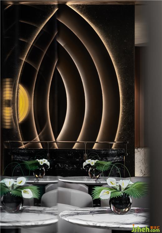 利落的幾何變體作用于空間,如水波紋擴散,如沙脊線暈染,綠意妝點其間,天地自然囊括于此。水吧區(qū)設計師與施華洛世奇聯(lián)合打造的水晶壁燈,營造空間視覺中心,古銅色金屬的厚重與切工水晶的剔透突破了工藝和創(chuàng)新的界限,照亮一室璀璨。