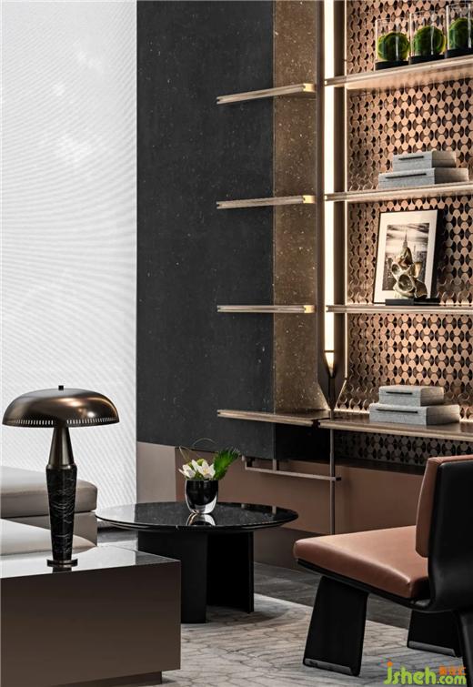 冷暖色組合的圍合性家具,營造家的真實感受和舒適商談氛圍,光影交錯下,一抹活力橘,作為跳躍色點燃空間情緒,傳達著古典與現(xiàn)代并存的奢華美學。