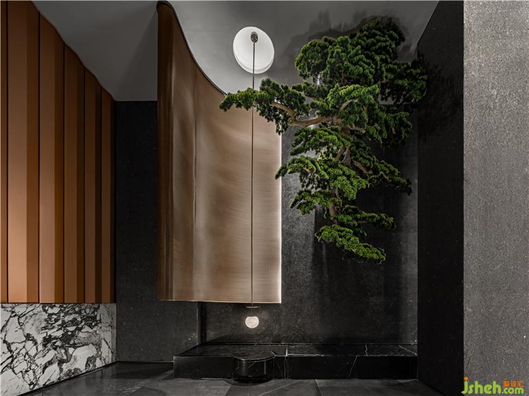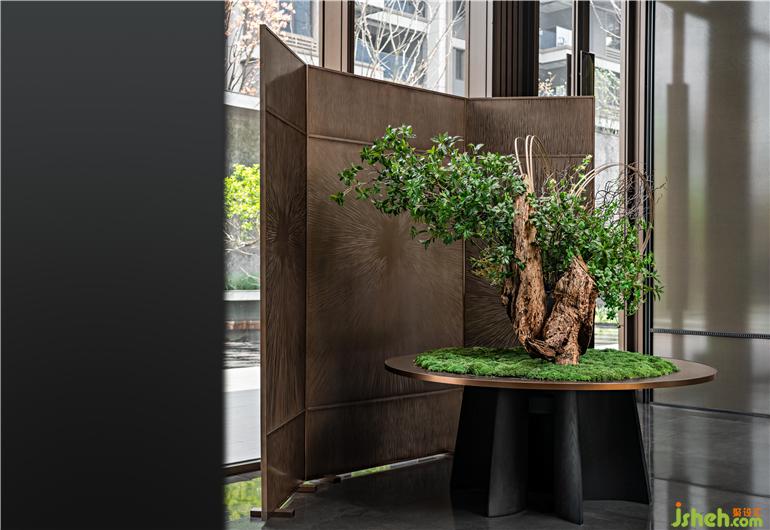 挑高的落地窗,猶如巨幅畫框,成都龍湖瑰云里營銷中心設(shè)計將窗外的視野納入室內(nèi),名為Otéro(奧特羅)的銅鏈?zhǔn)止舭摑櫆嘏挠行螣o形,如珠寶墜于美人脖頸,視線過渡到深木色長桌及淺色皮制座椅,桌面自然花藝調(diào)和色調(diào),跳躍其間,整體調(diào)性與自然和諧相成,趣味橫生。