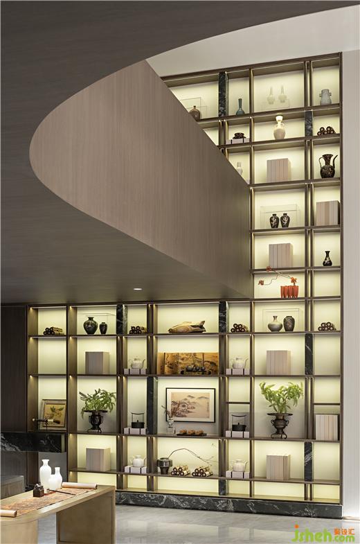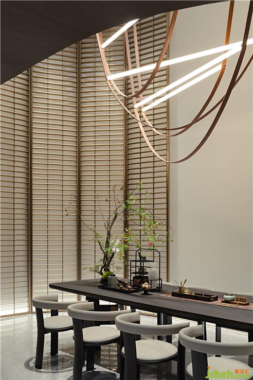 茶室從宋代夏圭的山水畫(huà)《溪山清遠(yuǎn)圖》中汲取靈感,將西方建筑語(yǔ)匯融入東方畫(huà)境,藝術(shù)形態(tài)的吊燈有如泉水般,光線傾瀉而下,配以長(zhǎng)條案桌,渾厚利落,猶如金石篆刻,清澈、挺拔的生機(jī)貫穿結(jié)構(gòu)與線條中。
