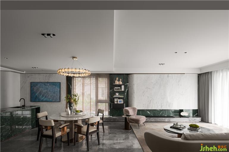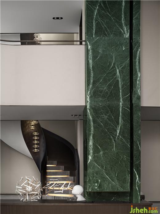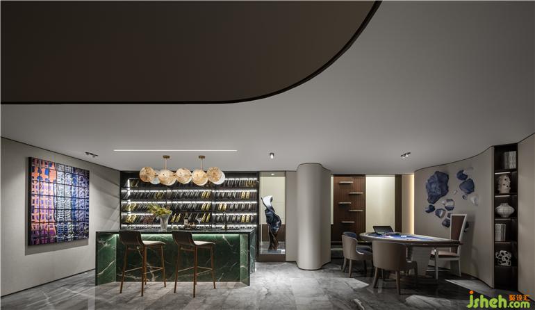 無錫融創(chuàng)CHINA山水江南樣板房設(shè)計拆除地下原建筑窗與隔墻,提升空間利用率的同時打造室內(nèi)庭院景觀,玉紋綠大理石看似隨意點綴各處,如一灣又一灣的太湖綠波串聯(lián)起整個空間,實現(xiàn)隔而不斷的過渡層次。