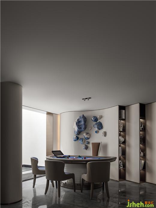 曲線裝飾墻鑲嵌湖石裝置,在光影的作用下,仿佛透過清澈的湖水探到湖底,體塊與色彩的互動,室內(nèi)與室外彼此映照,無錫融創(chuàng)CHINA山水江南樣板房設(shè)計探索著社交空間的新造型。