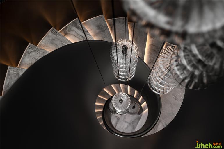 無錫融創(chuàng)CHINA山水江南樣板房設(shè)計利用不同材質(zhì)特性營造視覺沖突,以多元的變化視角,在空間中著色流光。旋轉(zhuǎn)樓梯擁抱成鸚鵡螺的形態(tài),白色大理石映襯珍珠般的光澤,水晶燈整齊排列,如深海中懸浮的水母,自由的符號隱晦地在場所中告白。