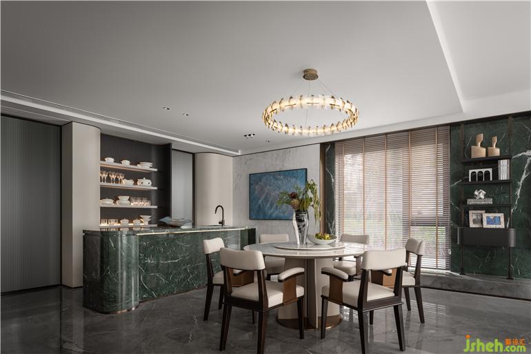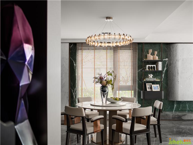 圍坐是中國文化團(tuán)圓和氣親密無間的表象,花藝迎接陽光,與自然風(fēng)光交織出靜謐恣意的氛圍,天花上游魚吊燈點亮串聯(lián)空間的”太湖碧波“,如果空間是一首詩,也要是主題鮮明的那一首。
