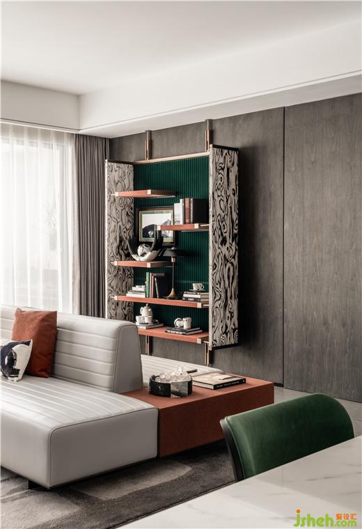 無(wú)錫金地華著樣板房設(shè)計(jì)以現(xiàn)代主義去融合江南文人的含蓄與靜默,書(shū)房中以大面積陳列架衡量空間尺度,突破傳統(tǒng)書(shū)房的采光樣貌,搭配落地飄窗,引入自然光以慰藉內(nèi)心的精神世界。