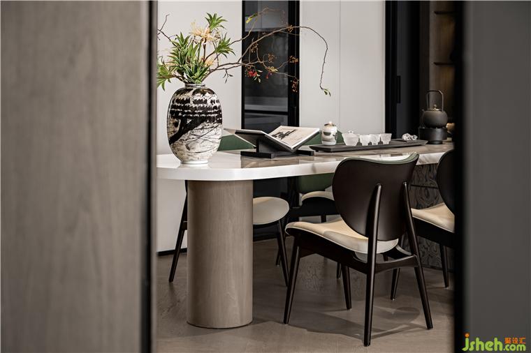 無(wú)錫金地華著樣板房設(shè)計(jì)餐廳主燈由四個(gè)水平排列的深色橢圓形組成,每個(gè)橢圓形都帶有一個(gè)發(fā)光的外殼。