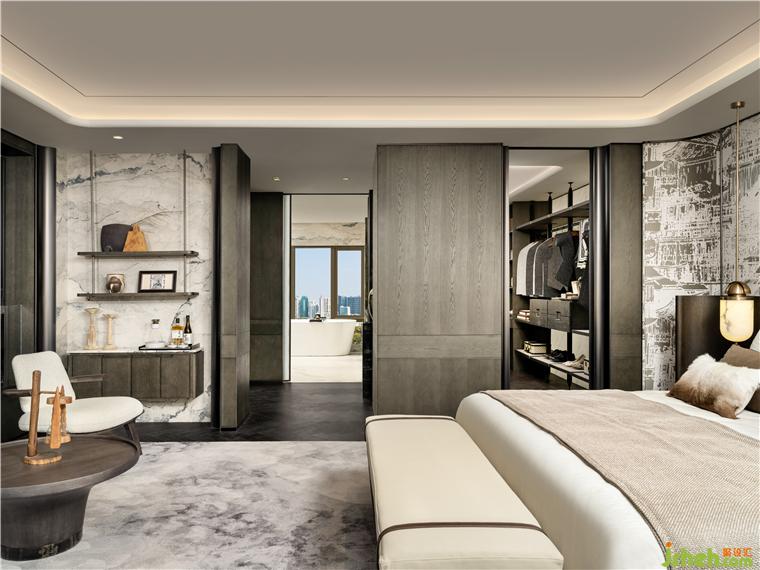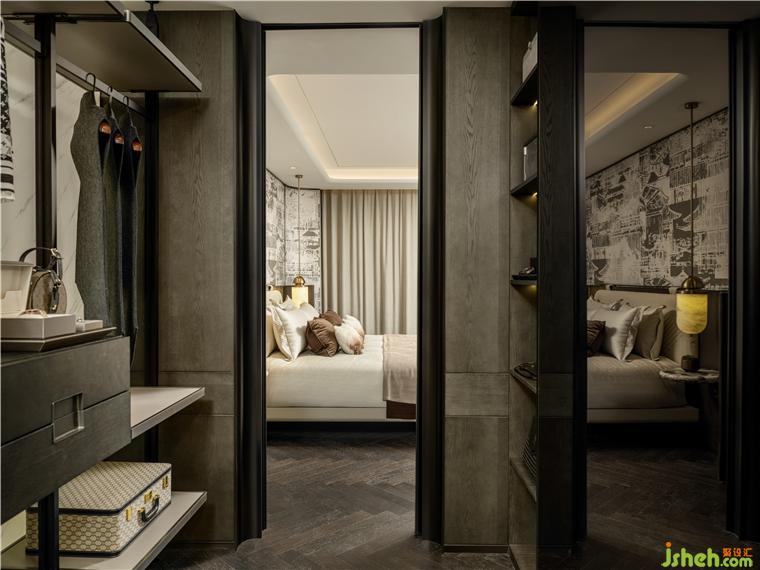 引入主臥衣帽間的設(shè)計,延伸至吊頂?shù)耐评T保證了私密性亦撩撥起屋主的收藏癖,不妨展開想象。