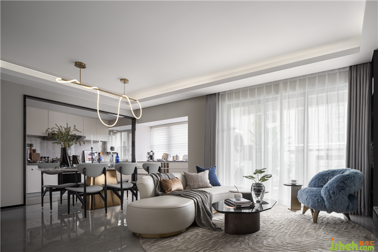 客廳空間全開放的布局,極大地延伸了縱深感,軟裝以明亮干凈為主,大面積落地窗加強室內(nèi)外的聯(lián)動。追求在藝術(shù)優(yōu)雅的基調(diào)下加以細(xì)微點綴,局部金屬材質(zhì)的運用也增加了整個空間的品質(zhì)感。