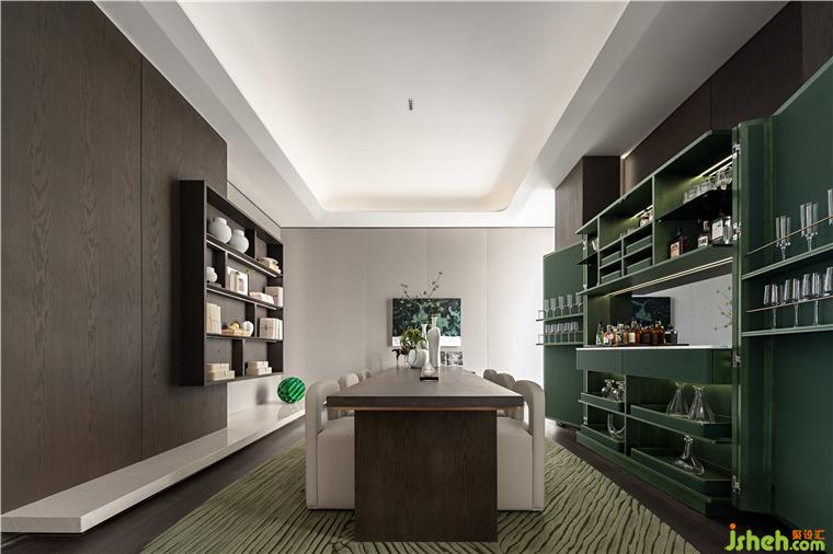 威士忌酒吧的經(jīng)典冬青綠與茶室的“海上生明月”藝術(shù)裝置的翠色呼應(yīng),達(dá)成了空間內(nèi)的動(dòng)態(tài)平衡。青翠之色,也寓意著慈溪作為中國最古老的青瓷產(chǎn)地的獨(dú)特魅力。