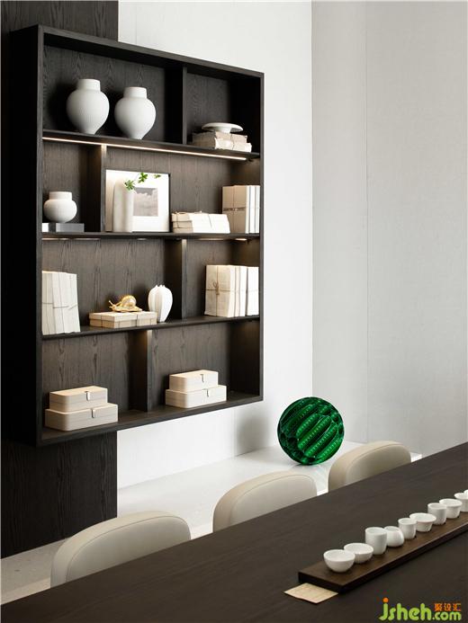 象牙色的天花板和墻面增大采光面積,烏木色的整面書墻、水墨花紋的大理石茶幾與烏木矮幾書架構(gòu)造出一方室內(nèi)的江南的庭園生活。