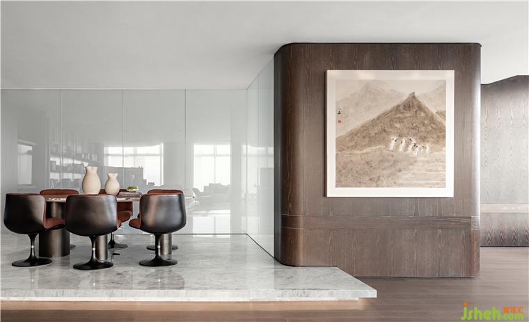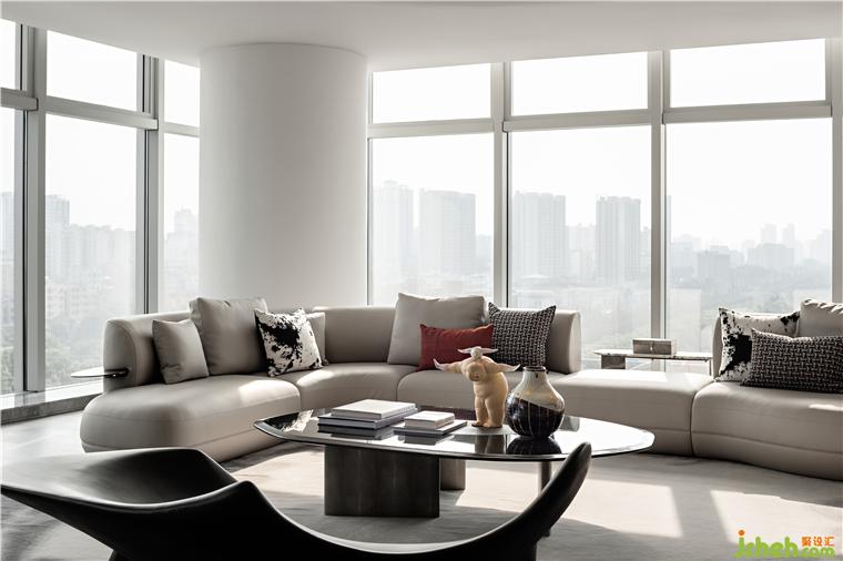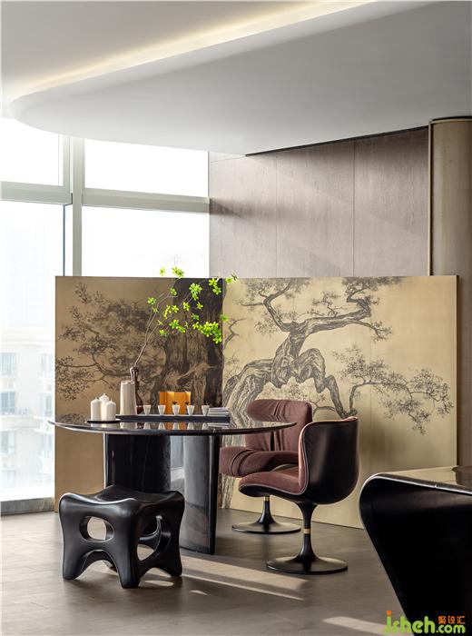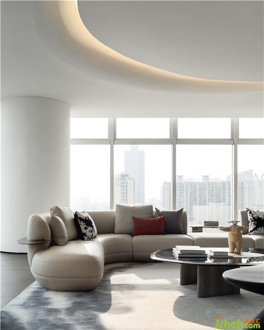 蜿蜒如流水的沙發(fā)與水墨紋理的地毯相得益彰,在這樣的一個(gè)躍層空間中,自然光從落地大窗傾斜進(jìn)來與沙發(fā)的皮質(zhì)交融,散發(fā)盈盈的光澤,通透而靈活。沙發(fā)來自設(shè)計(jì)師黃全原創(chuàng)家居品牌「幾間」。