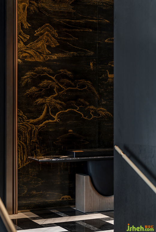 移步首層大堂,引入眼簾的巨幅漆畫帶給人氣勢(shì)磅礴的視覺震撼,營銷中心設(shè)計(jì)以傳統(tǒng)描金工藝手工繪制的山水樓閣圖,布局疏朗有致,彰顯出濃郁的藝術(shù)氣質(zhì),以及清新雅致的文人氣息。地面拼花材質(zhì)隱喻“步步生花”,與藝術(shù)的漆畫相互呼應(yīng),賦予了歸家之路的尊享化體驗(yàn)。溫柔潔凈的石材,搭配高貴氣質(zhì)的深色木飾面,光在空間的遞進(jìn)中溢出,形體的繁復(fù)將人們游移的視野填滿瑩然的焦色光,如同玉石的溫潤和質(zhì)感,將玻璃的朦朧、拼花地板的復(fù)古和石材拼接而成的墻面的肌理感,逐一映襯、渲染。