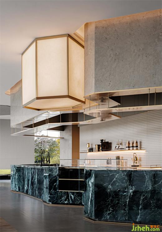 水吧區(qū)與接待臺(tái)形成自然流暢的空間布局,金屬層架在暖色燈光的映襯下,盡顯奢華的氣質(zhì),森林綠奢石臺(tái)面如同城市森林中的一抹獨(dú)景,連貫的線條串聯(lián)起不同的社交場(chǎng)景,賦予了空間無(wú)上的想象力。