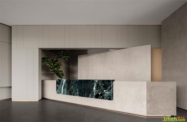 售樓處設(shè)計(jì)接待臺(tái)以森林綠奢石搭配宇宙灰大理石,深邃的不規(guī)則綠色,沉穩(wěn)的色澤散發(fā)雋永的魅力,搭配綠植造景,讓每一位駐足的參觀者感受到蓬勃的自然氣息和生命力。