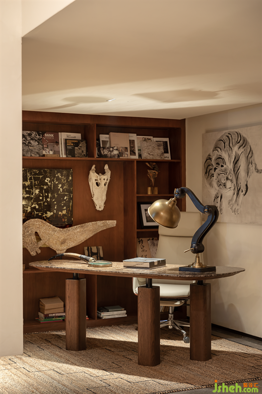 步入靜謐的書房,展示柜上陳列著居者的藝術(shù)藏品,一方書桌承載起生活的氣息,復(fù)古風(fēng)格的金屬臺(tái)燈,映襯著棕色花紋的大理石臺(tái)面,柔和的線條,溫潤(rùn)的色調(diào),終覺內(nèi)心寧?kù)o。