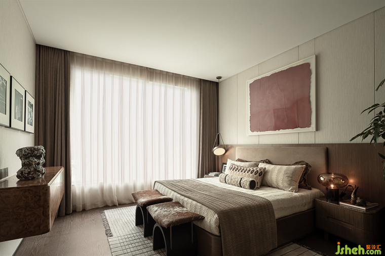 次臥延續(xù)了暖棕色調(diào)的氛圍,詮釋內(nèi)心的靜謐,紅棕色的藝術(shù)畫作為一抹點睛,樣板房設(shè)計賦予了空間溫暖的氣息,窗外的喧囂被巧妙地隔絕,時光的質(zhì)感在這里變得生動而具象,仿佛可以觸摸,可以感受,讓人沉醉其中,忘卻外界的紛擾。