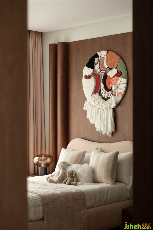 女孩房以夢幻的粉色為主色調(diào),在床頭背景處打造出立體帷幔的藝術(shù)裝置,如同一幅畫卷徐徐展開,搭配編織藝術(shù)掛毯,賦予空間無盡的想象力和藝術(shù)感。