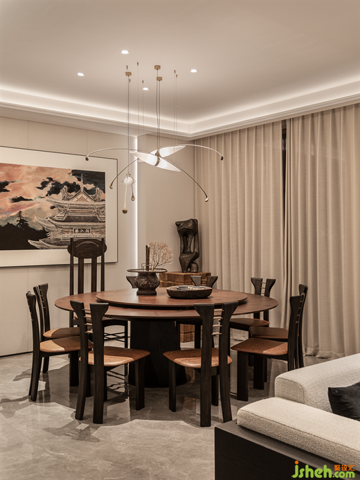 客餐廳選用滕王閣元素作為主題藝術(shù)畫強調(diào)了空間的在地性和歸屬感,大面積松韻地毯將空間主題串聯(lián)。南昌地域性元素與東方自然元素,營造雅士登高望遠,依山而居的愜意生活場景。