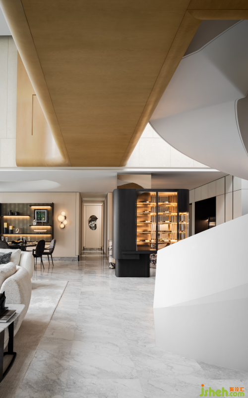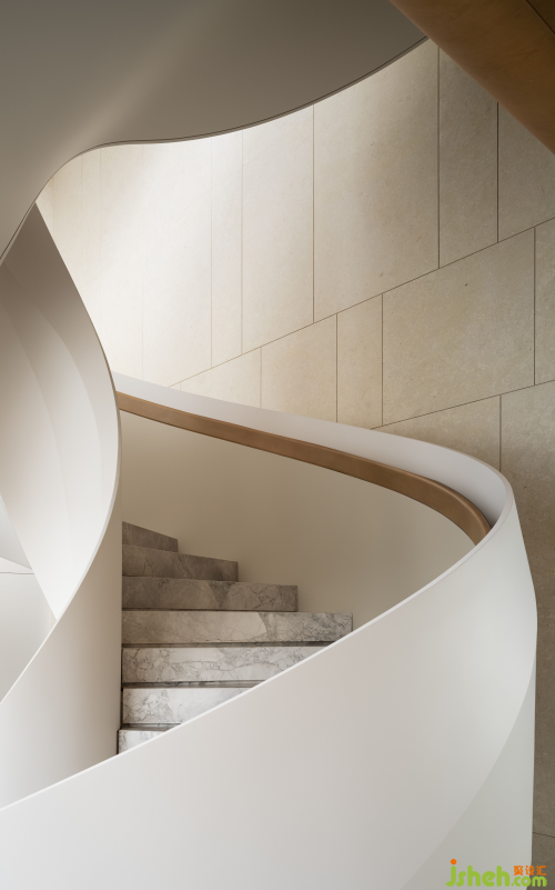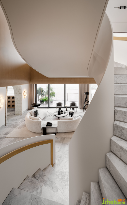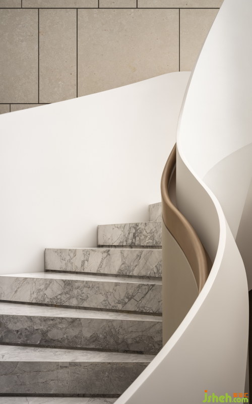 沿著藝術(shù)樓梯拾階向上,通往二層的休息區(qū),樓梯扶手處以多層配色細(xì)節(jié),串聯(lián)起樓層之間的色調(diào),打造如絲帶般的流暢曲線,呼應(yīng)著窗外蜿蜒的江水。