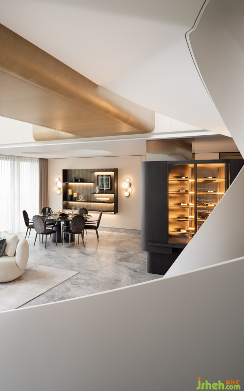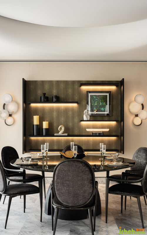 餐廳區(qū)域,位于客廳一側(cè),以開放式布局與客廳自然銜接,既保持了空間的通透感,又賦予了用餐時光更多的情感交流空間。餐桌旁搭配墨綠色暗紋的開放式陳列柜,展示了居者的精致收藏品。半月造型的頂部天花板設(shè)計,更營造自然與靈動的氛圍。