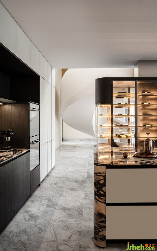 廚房,則是另一番天地。西廚島臺以寶格麗白大理石的冷艷,彰顯著品味與格調(diào),而中廚區(qū)的煙火氣,則讓這份奢華多了幾分人間煙火的味道,美食與愛的故事,在這里悄然上演。