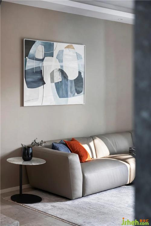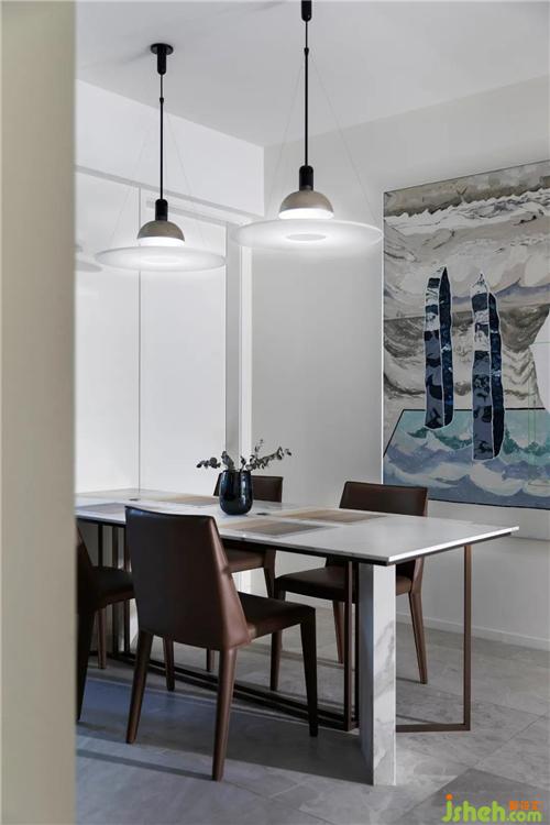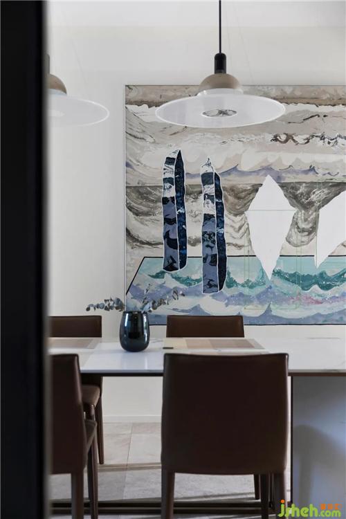 At the dining table, there is a large abstract painting. The cool and warm colors are just right, which makes the family feel relaxed.