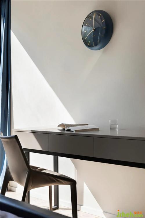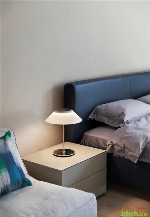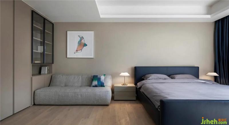 裝修設(shè)計(jì)主臥更是把駝棕和蔚藍(lán)這兩種色彩運(yùn)用得愈加飽滿。斜陽和煦,心生安定。