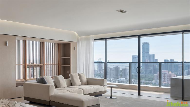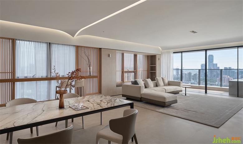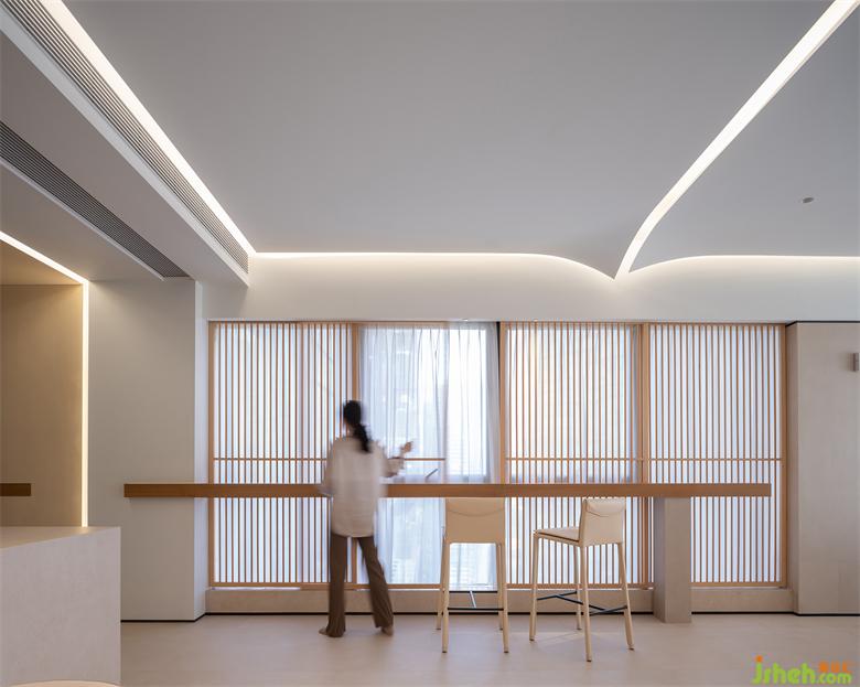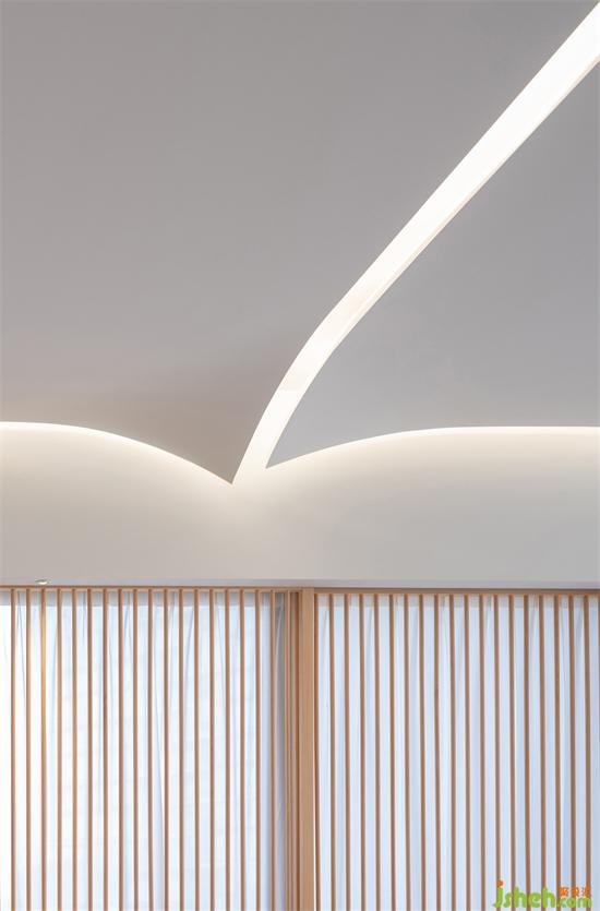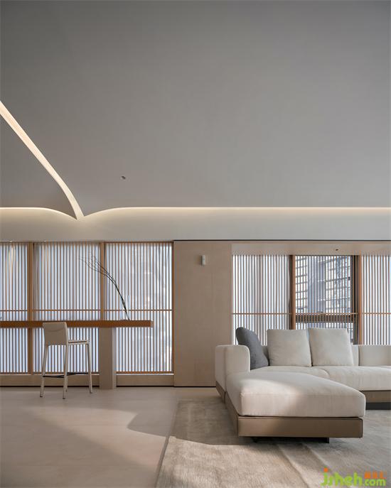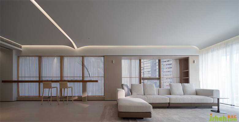 白凈的天花像書(shū)頁(yè)、像紙張被風(fēng)吹過(guò),微微卷曲。在這車(chē)水馬龍的瓊樓之上,沒(méi)有繁雜的裝飾,只有純粹的簡(jiǎn)單。家裝設(shè)計(jì)居住在這樣的空間里,物質(zhì)的東西不多,但卻能傾聽(tīng)自己的聲音,求得一份內(nèi)心的平靜。