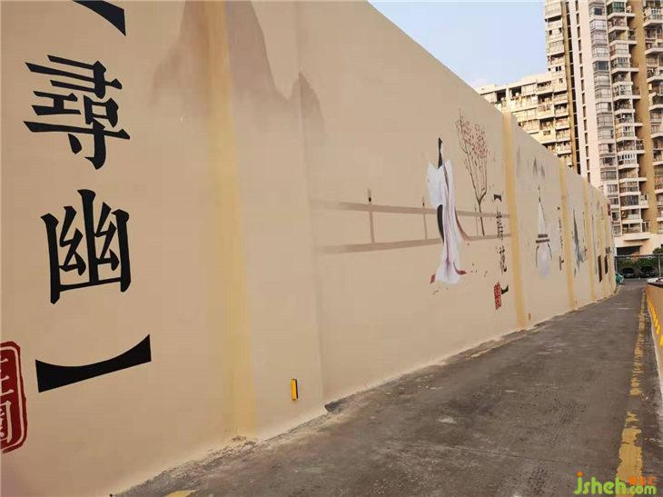 在兩個入口坡道邊用人物或山水意境畫引人入境,考慮到坡道的安全,在墻角裝有黃色安全反光牌保障來往的車輛安全。