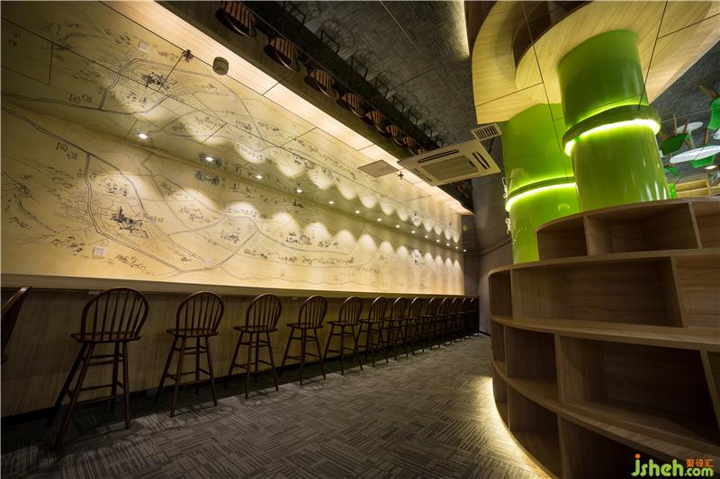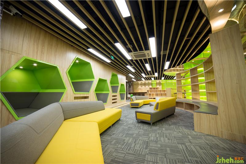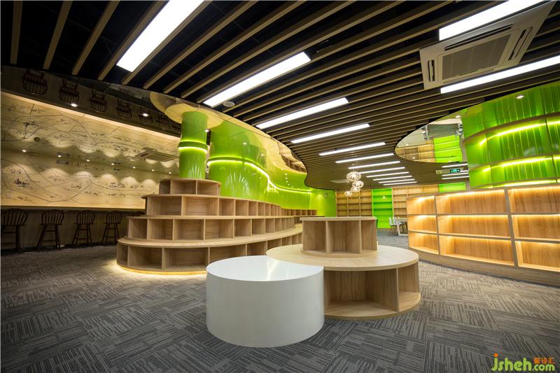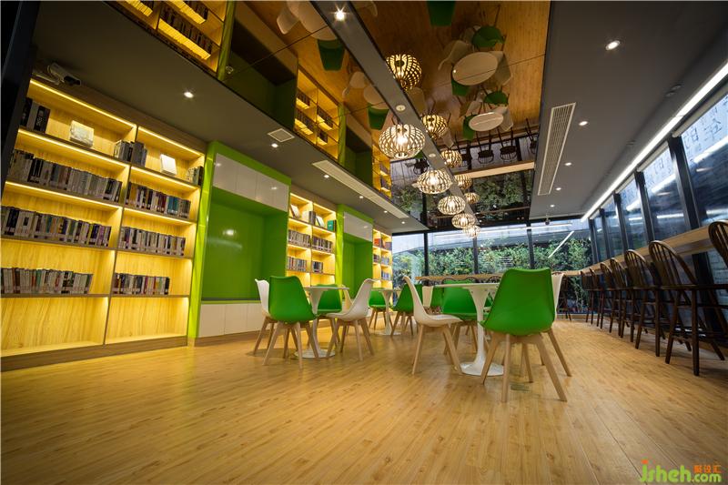 中心區(qū)域弱化了原有空間內(nèi)柱子對(duì)整體視覺上的影響,配合玻璃吊頂,解決了層高偏矮的空間問題。提升整體視覺效果,書架與閱讀區(qū)域的整合,提供了更多的書籍儲(chǔ)藏與閱讀空間。