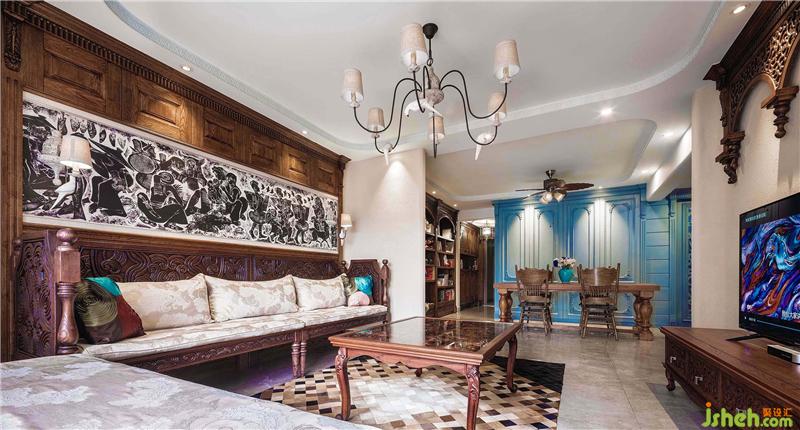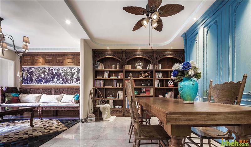 客廳和餐廳完全開(kāi)放的設(shè)定,從比較壓縮的玄關(guān)空間轉(zhuǎn)換到開(kāi)放寬敞的空間,達(dá)到視覺(jué)和心境的轉(zhuǎn)換??蛷d作為待客區(qū)域,墻面通過(guò)使用木飾面、仿舊肌理裝飾,地板鋪貼巴黎世家仿古瓷磚,搭配歐式復(fù)古家具,整體空間簡(jiǎn)潔懷舊、實(shí)用舒適,寬敞而富有歷史氣息。